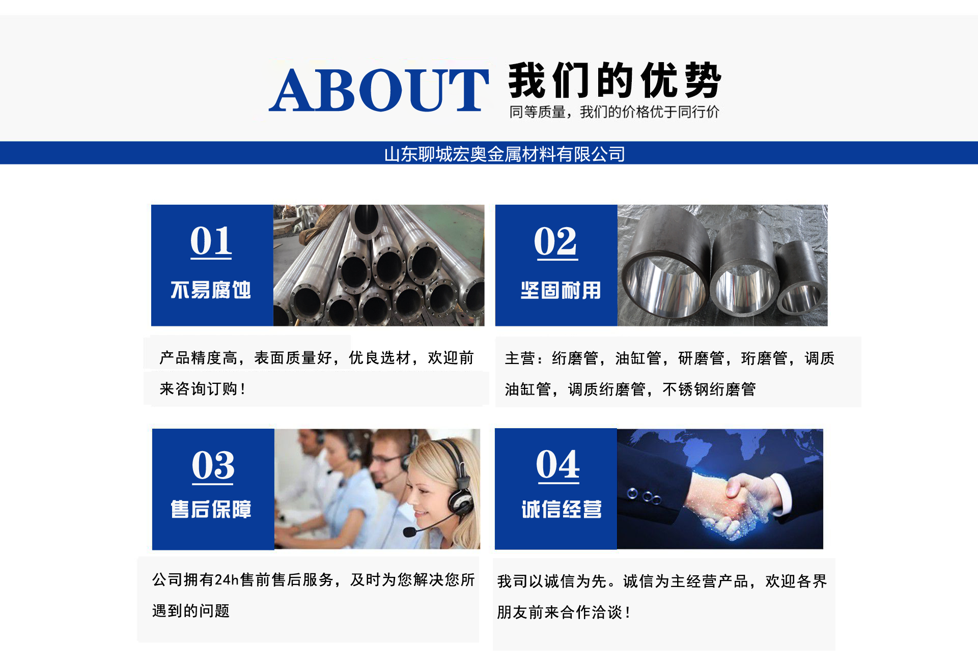 山東聊城宏奧金屬材料有限公司位于風景秀麗的江北水城-聊城。地理位置優(yōu)越,交通便利。主營絎磨管,油缸管,研磨管,珩磨管,調(diào)質(zhì)油缸管,調(diào)質(zhì)絎磨管,不銹鋼絎磨管等產(chǎn)品 廣泛應(yīng)用于礦山、起重、船舶、煤炭、運輸、化工、科研、軍工等工業(yè)領(lǐng)域。 公司憑借雄厚的實力,豐富齊全的規(guī)格品種,完善的質(zhì)量保證,合理的價格,優(yōu)質(zhì)的服務(wù),不斷地受到新老用戶及業(yè)內(nèi)人士的肯定和信任,我們本著及用戶之所及,想用戶之所想的服務(wù)宗旨不斷地拼搏,進取,在此對多年來支持我們的各行各業(yè)的新老朋友表示由衷的感謝,愿我們今后的合作更加愉快! 歡迎國內(nèi)外新老客戶來公司視察、蒞臨指導(dǎo)工作!...
